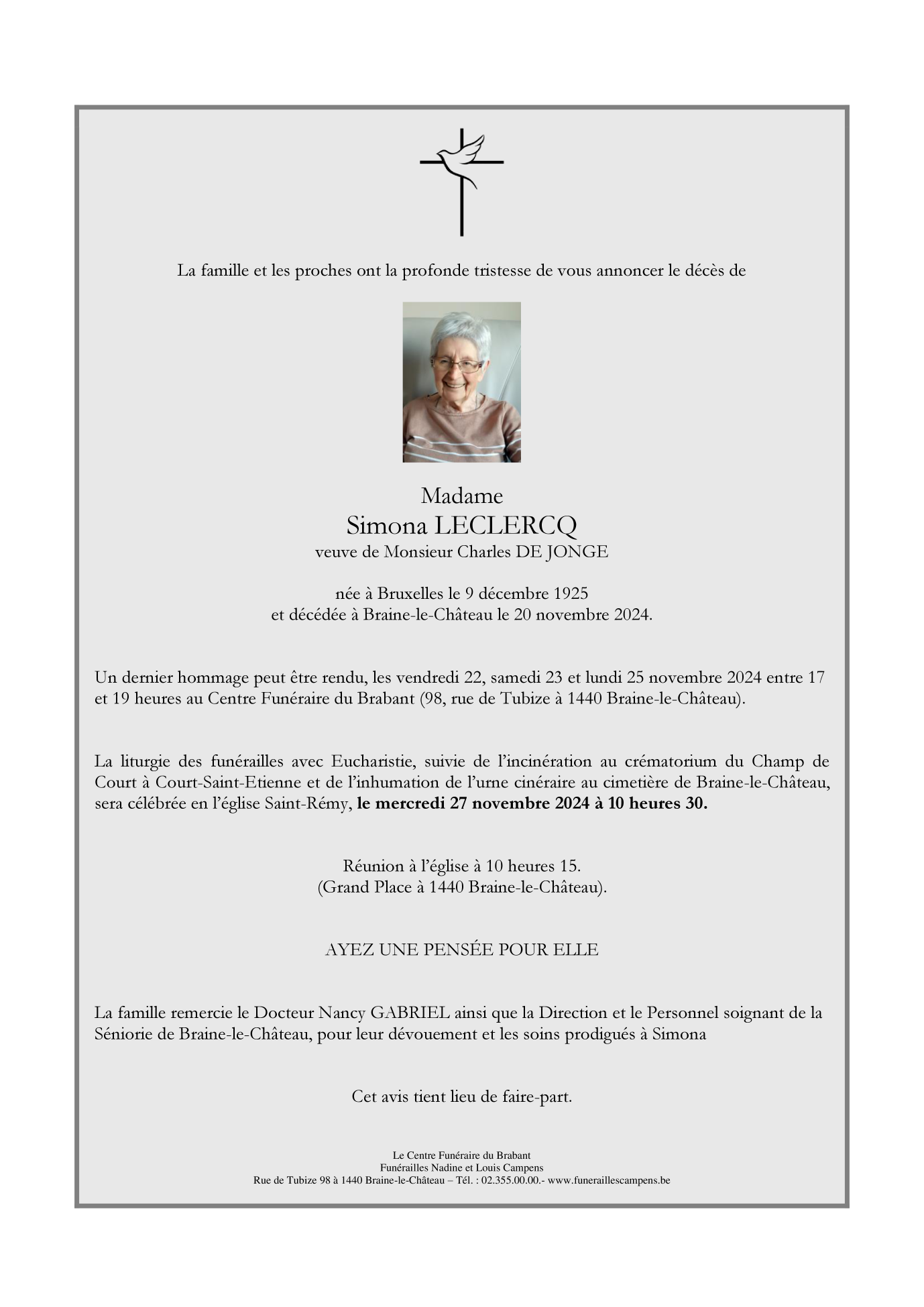 Décédée à Braine-le-Château (1440) le mercredi 20 novembre 2024 à l'âge de 98 ans