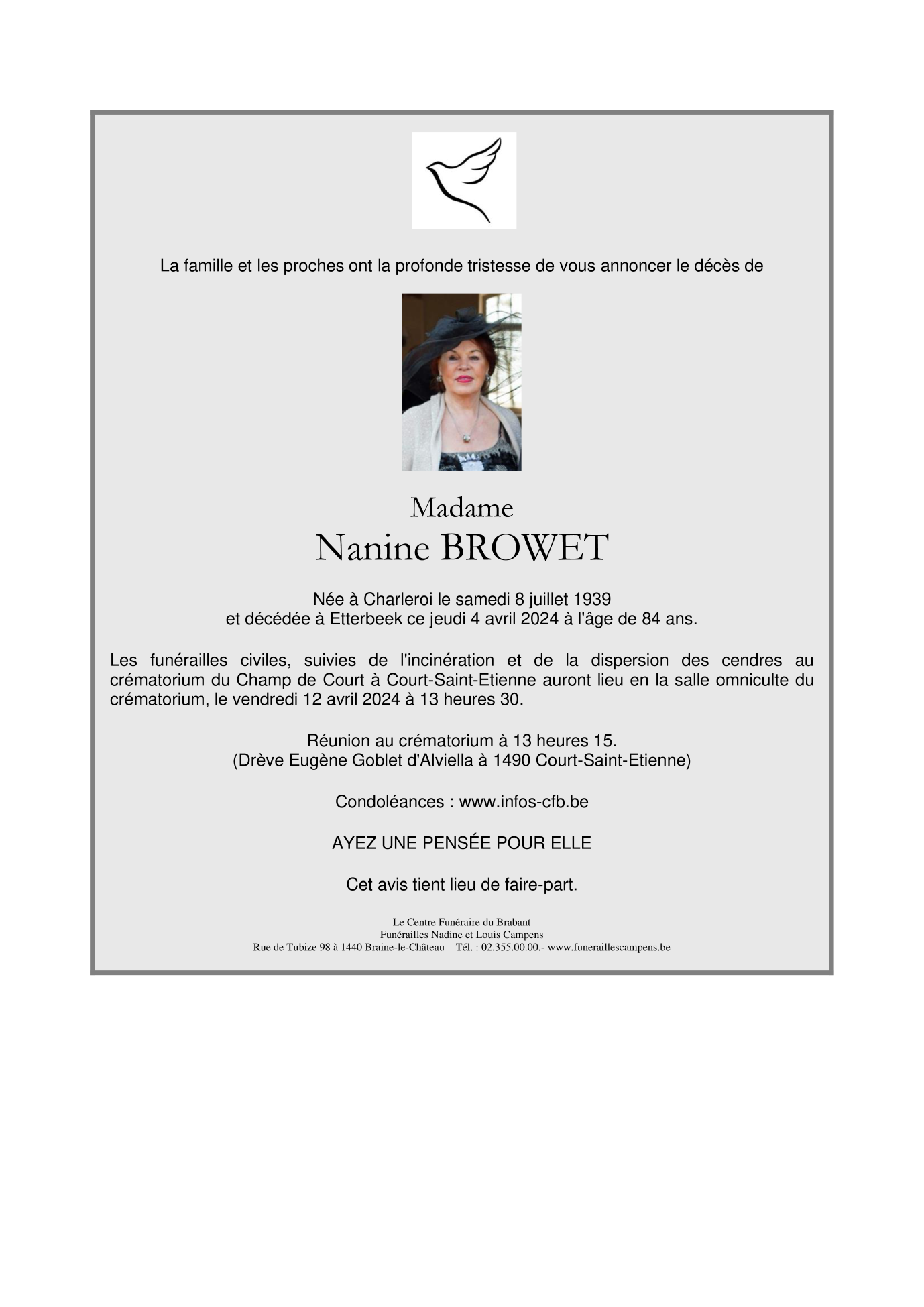 Décédée à Etterbeek (1040) le jeudi 4 avril 2024 à l'âge de 84 ans