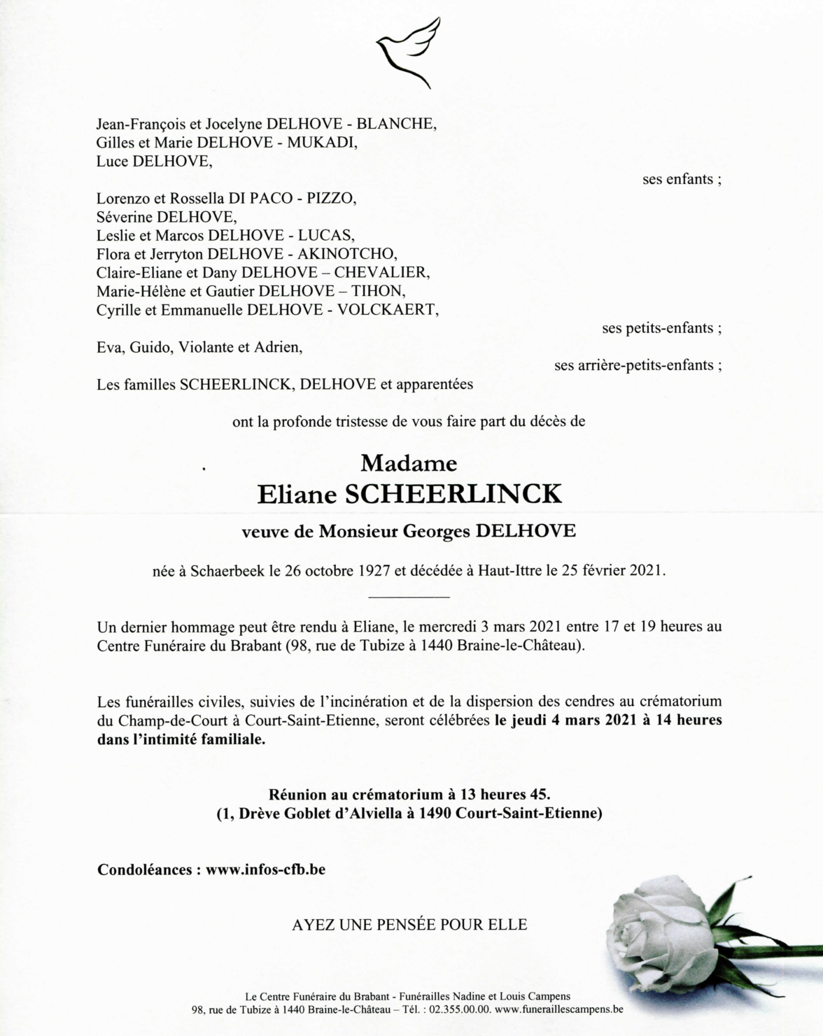 Décédée à Haut-Ittre (1461) le jeudi 25 février 2021 à l'âge de 93 ans