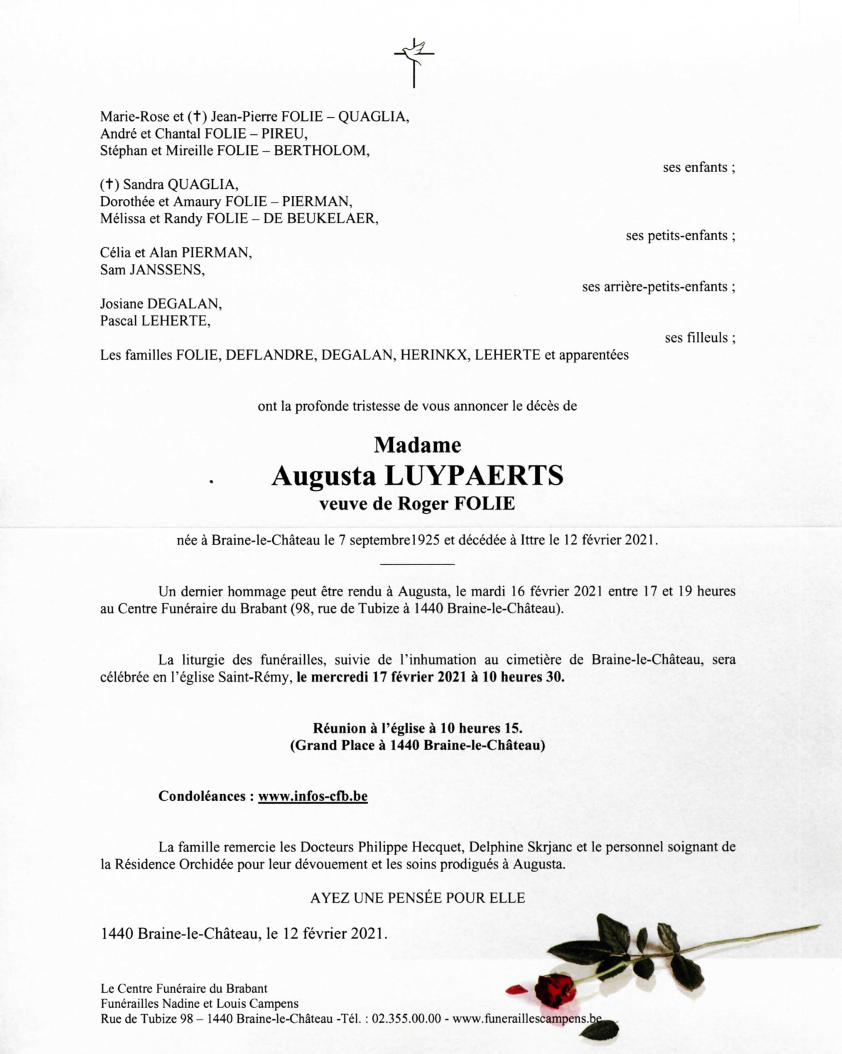 Décédée à Ittre (1460) le vendredi 12 février 2021 à l'âge de 95 ans
