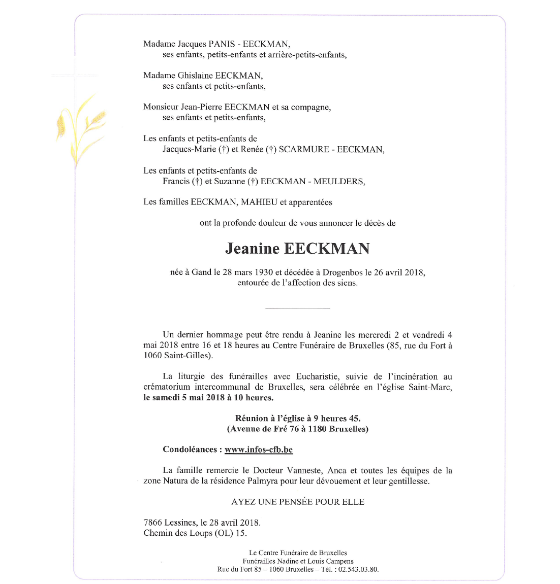 Décédée à Drogenbos (1620) le jeudi 26 avril 2018 à l'âge de 88 ans