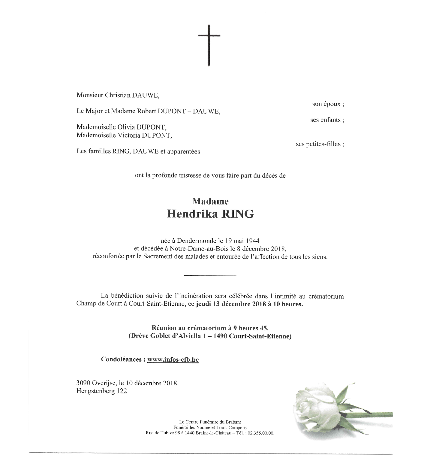 Décédée à Overijse (3090) le samedi 8 décembre 2018 à l'âge de 74 ans