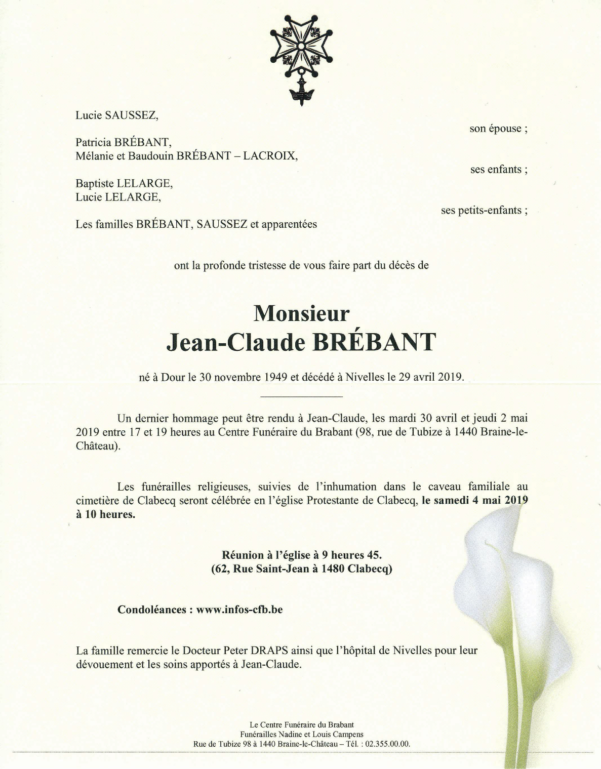Décédé à Nivelles (1400) le lundi 29 avril 2019 à l'âge de 69 ans