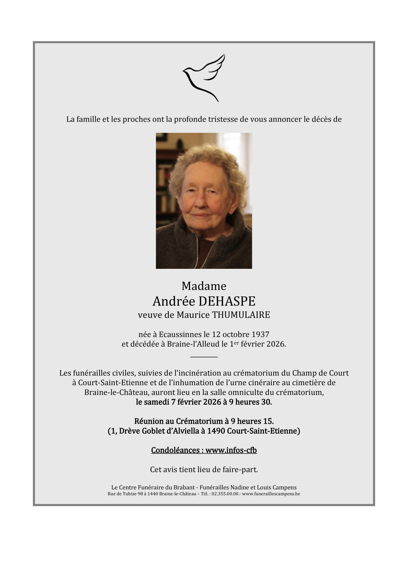 Décédée à Braine-l'Alleud (1420) le dimanche 1 février 2026 à l'âge de 88 ans