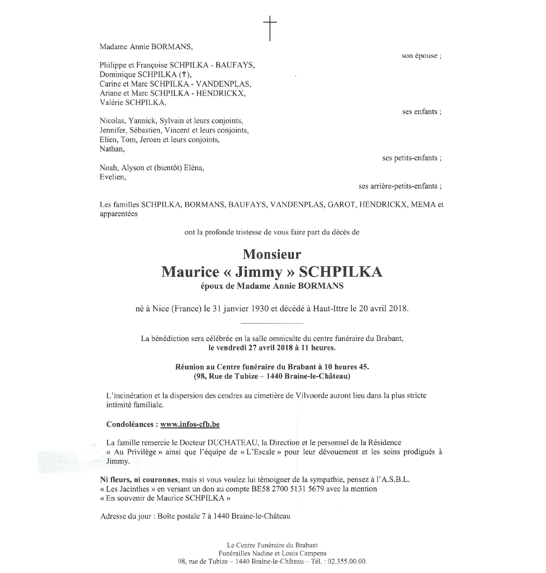 Décédé à Haut-Ittre (1461) le vendredi 20 avril 2018 à l'âge de 88 ans