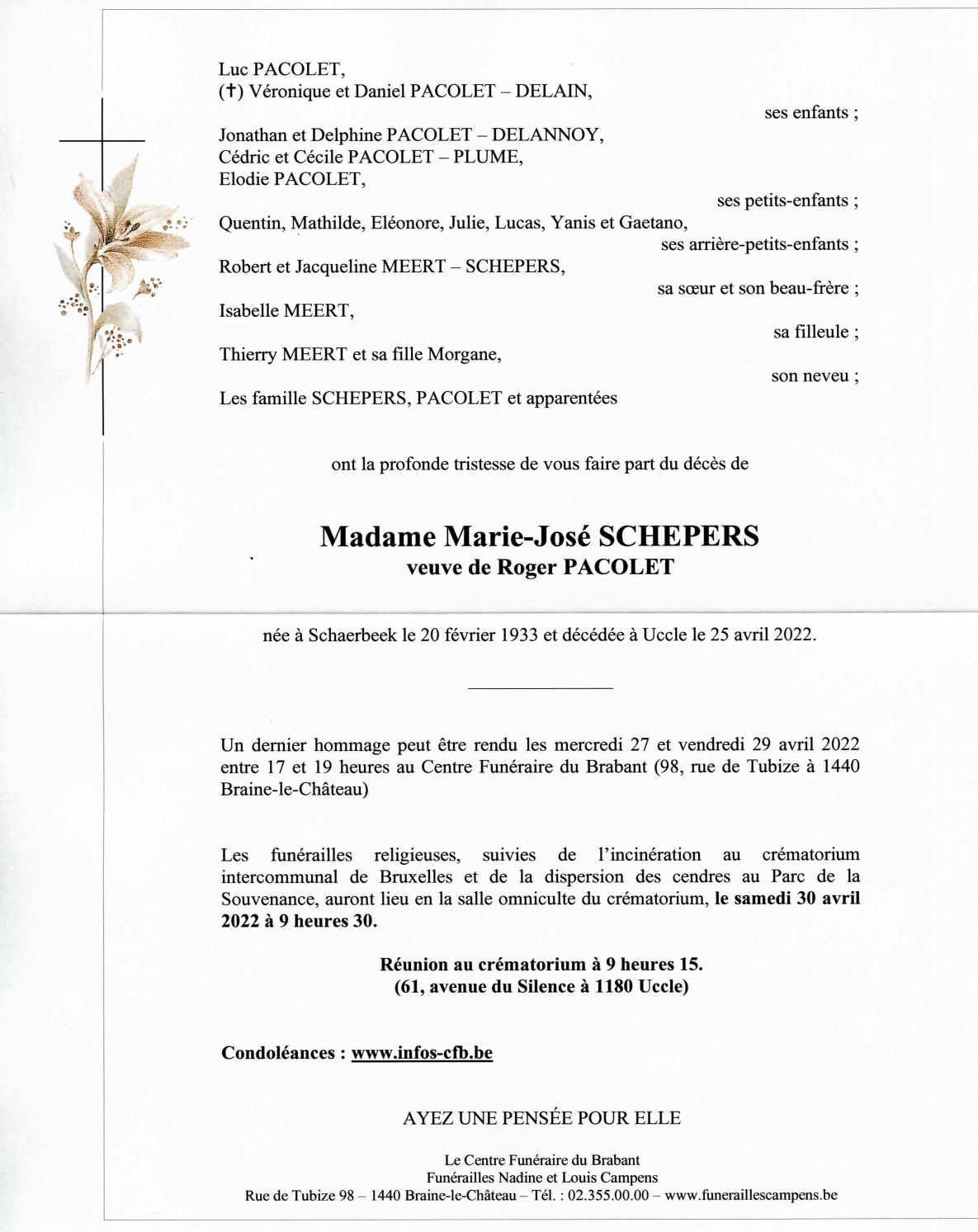 Décédée à Uccle (1180) le lundi 25 avril 2022 à l'âge de 89 ans