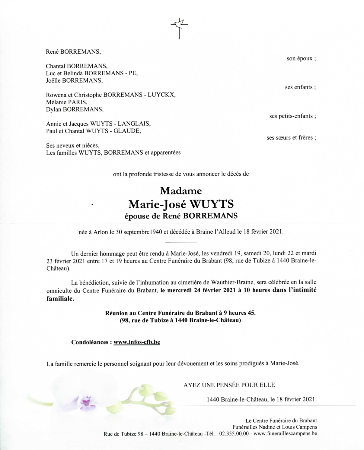 Décédée à Braine-l'Alleud (1420) le jeudi 18 février 2021 à l'âge de 80 ans