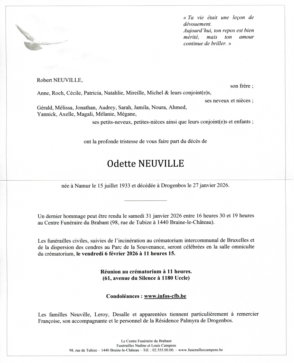 Décédée à Drogenbos (1620) le mardi 27 janvier 2026 à l'âge de 92 ans