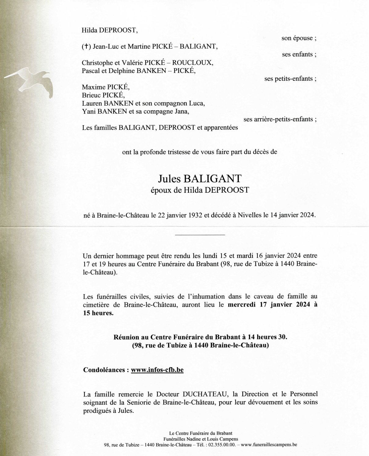 Décédé à Nivelles (1400) le dimanche 14 janvier 2024 à l'âge de 91 ans