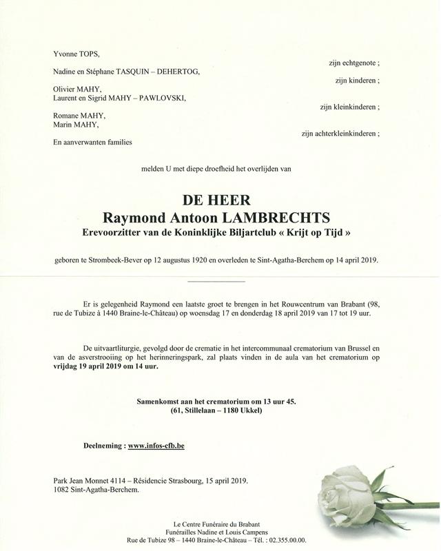 Décédé à Berchem-Sainte-Agathe (1082) le dimanche 14 avril 2019 à l'âge de 98 ans