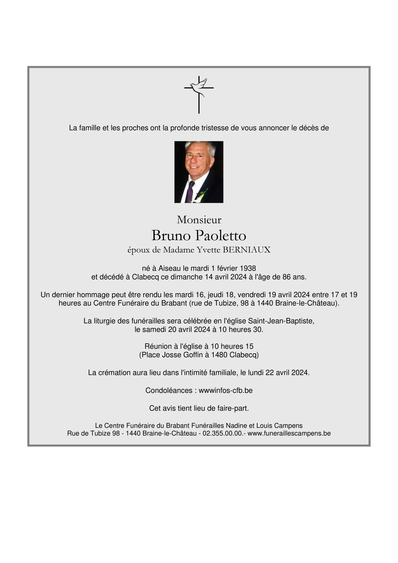 Décédé à Clabecq (1480) le dimanche 14 avril 2024 à l'âge de 86 ans