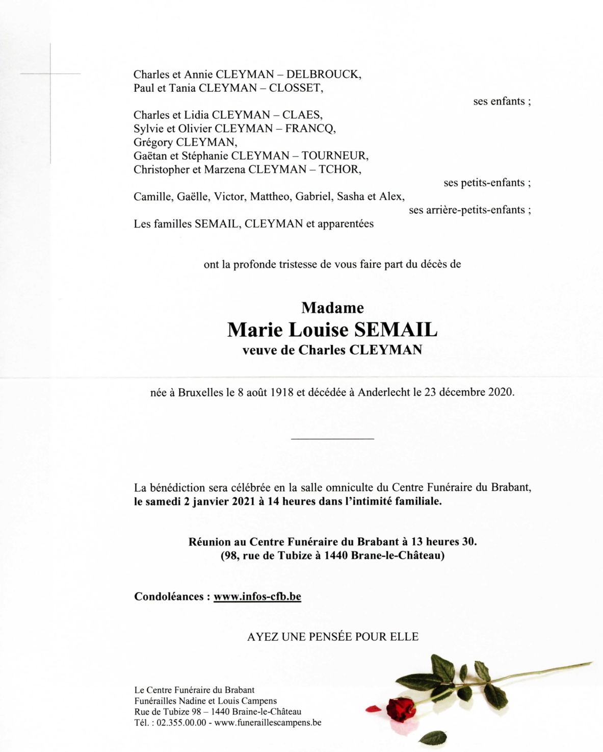 Décédée à Anderlecht (1070) le mercredi 23 décembre 2020 à l'âge de 102 ans