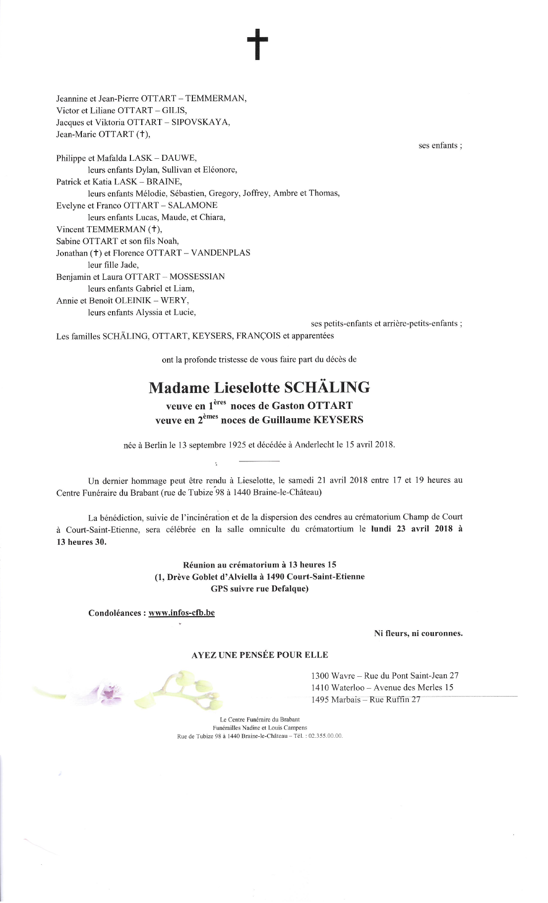 Décédée à Anderlecht (1070) le dimanche 15 avril 2018 à l'âge de 92 ans