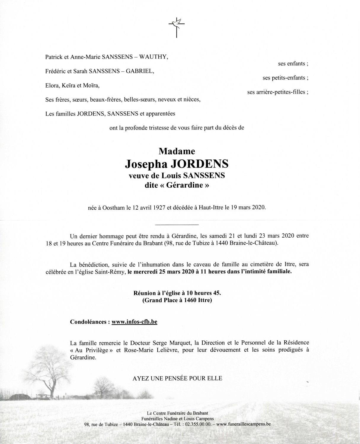 Décédée à Haut-Ittre (1461) le jeudi 19 mars 2020 à l'âge de 92 ans