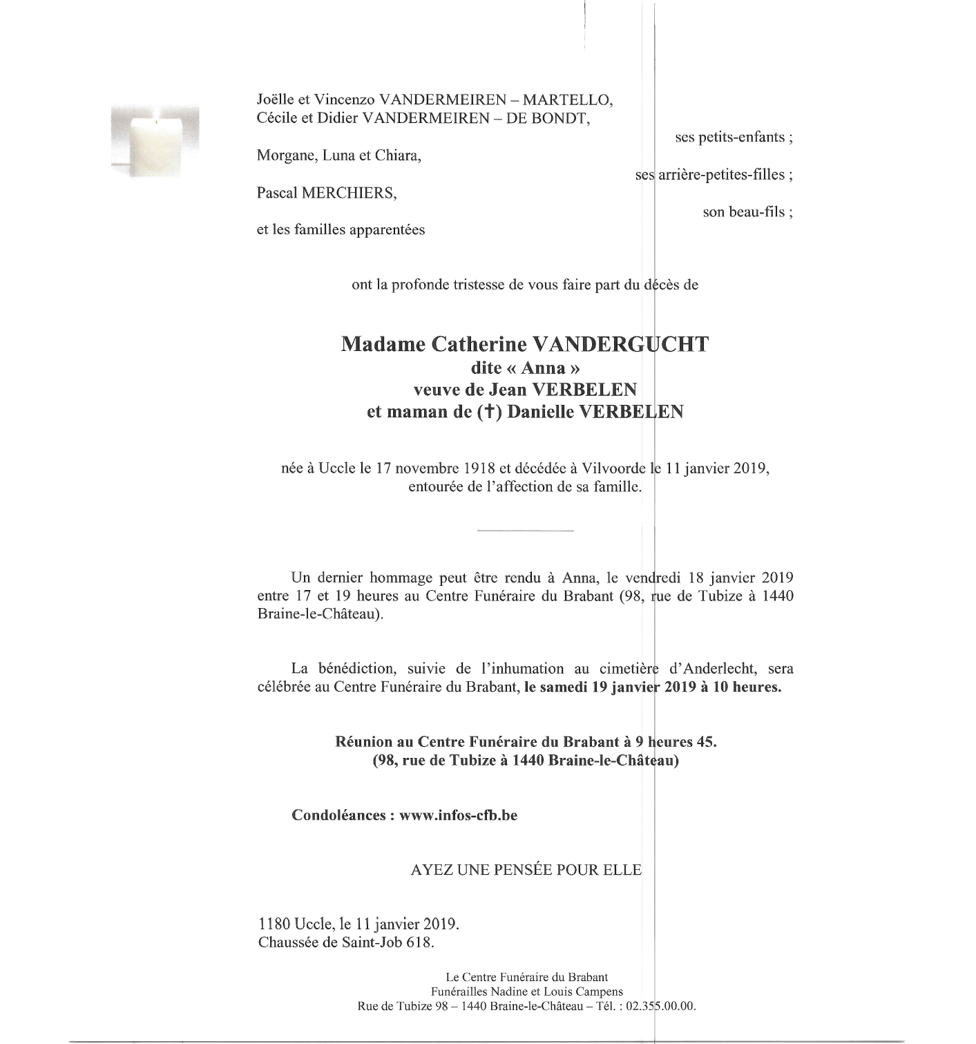 Décédée à Vilvoorde (1800) le vendredi 11 janvier 2019 à l'âge de 100 ans