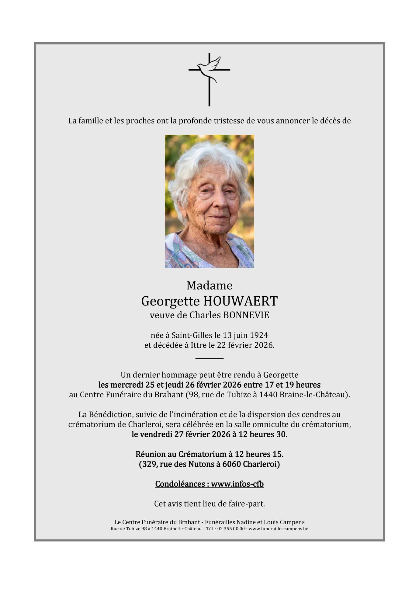 Décédée à Ittre (1460) le dimanche 22 février 2026 à l'âge de 101 ans